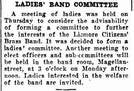 LADIES’ BAND COMMITTEE. (1930, 26 July). Northern Star (Lismore, NSW : 1876 – 1954), 8. http://nla.gov.au/nla.news-article94144077