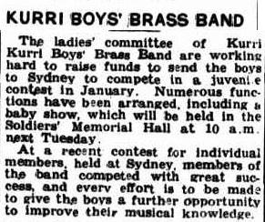 KURRI BOYS’ BRASS BAND. (1942, 04 December). Cessnock Eagle and South Maitland Recorder (NSW : 1913 – 1954), 3. http://nla.gov.au/nla.news-article99933708